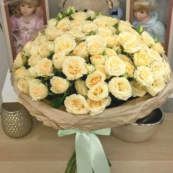 ДЕЛЮКС: роза кустовая кремовая - 25 шт, упаковка, лента кремовая. Примерный размер: 45Х45 см.